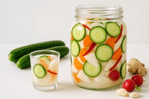 「水キムチ」は、唐辛子を使わずに野菜や果物を乳酸発酵させて作る、韓国の伝統的な発酵食品です。辛くないので子供でも食べやす